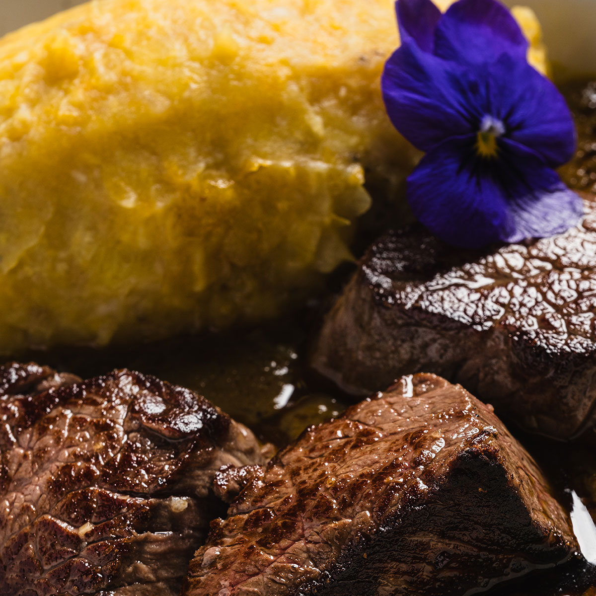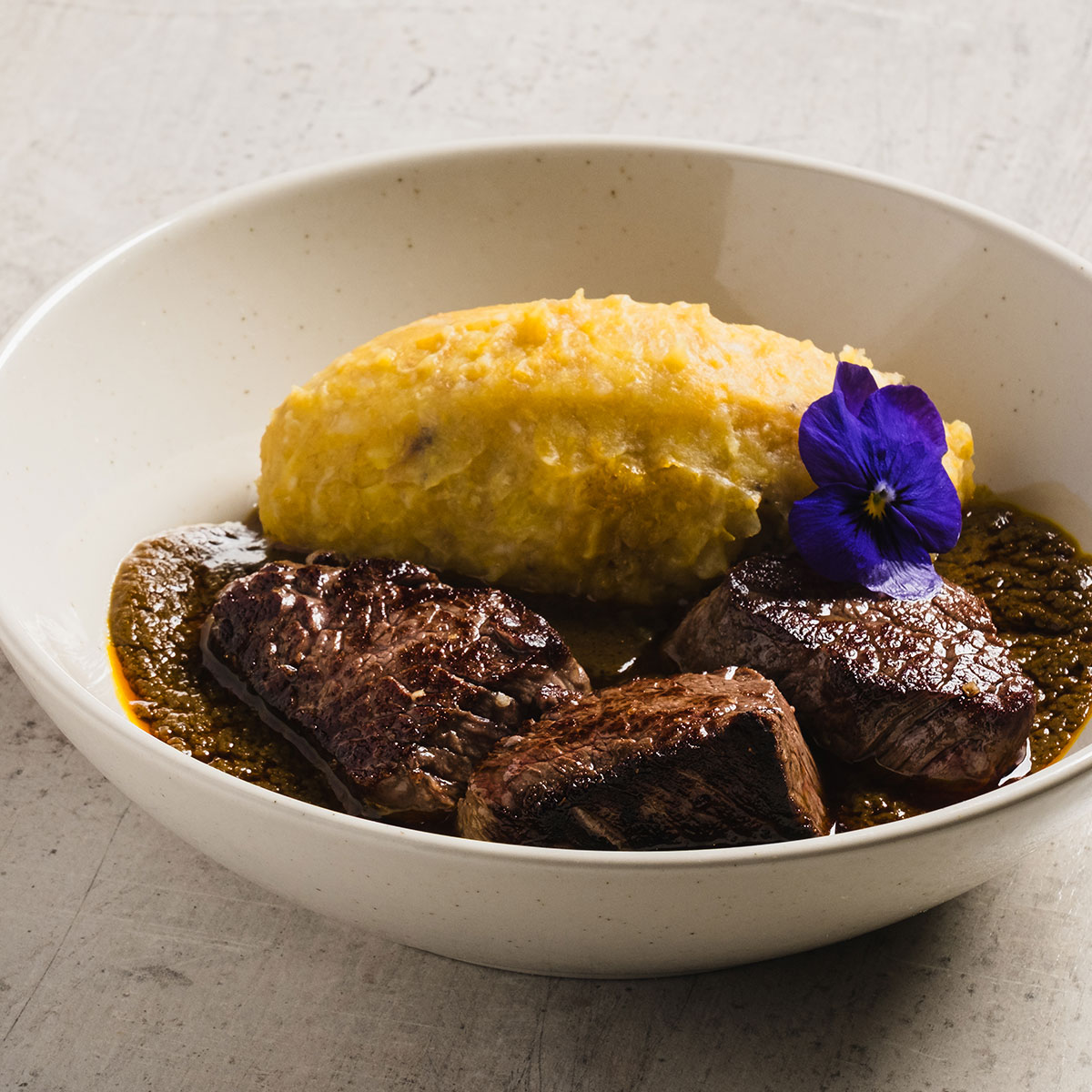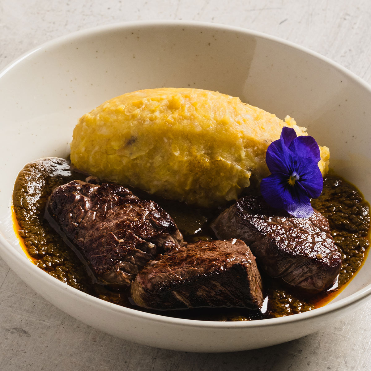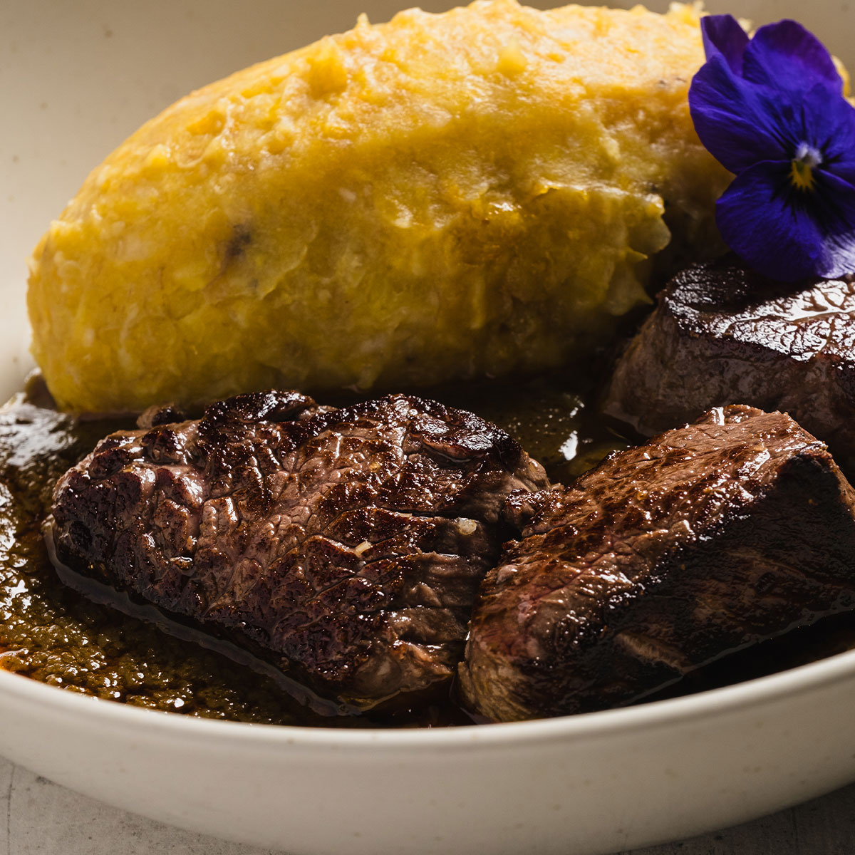 Foutou de bananes plantains sauce graine et que de bœuf wagyu